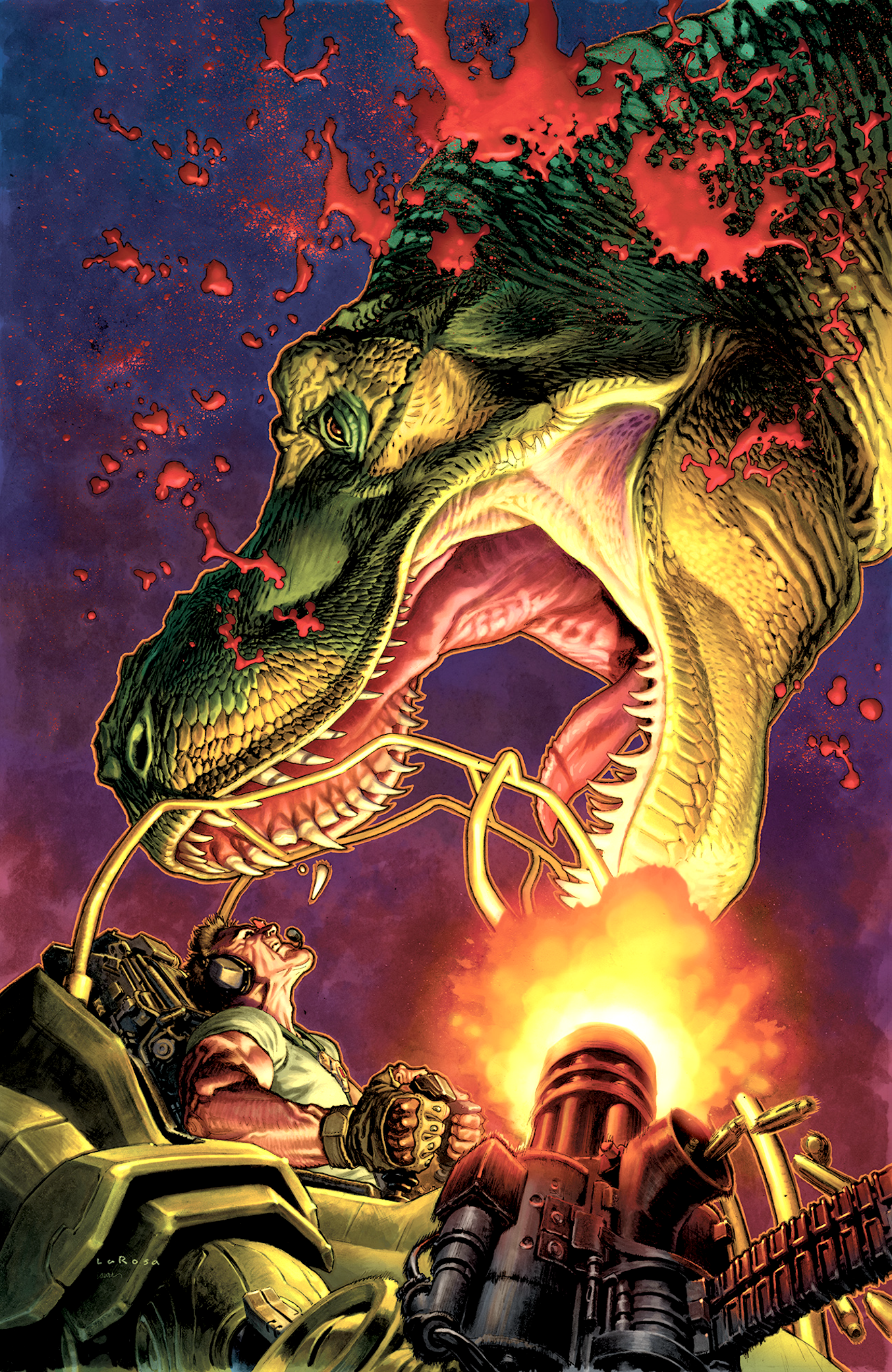The CEO of global energy conglomerate Greenleaf Oil has just discovered a terrifying secret: the planet only has a decade or less of petroleum left before it’s gone forever. But he has a plan to make sure his great-great grandchildren can continue to generate maximum shareholder value – and secure his own legacy in the process. Rather than develop a game-changing renewable energy source through the power of corporate innovation, Greenleaf has perfected the next best thing – time travel (duh) – so that a team of six field-rat contractors armed to the teeth in individually customized mech suits can go back to the Cretaceous Period, tweak the trajectory of the meteor that killed the dinosaurs, and give mankind another 500 millennia worth of oil reserves. What could go wrong? Only all of human history, of course – because when Greenleaf’s team of Tankers come home, they’ll discover that not only did the dinosaurs never die out, they’ve kept evolving for another 60 million years…and they’re more pissed off than ever.
